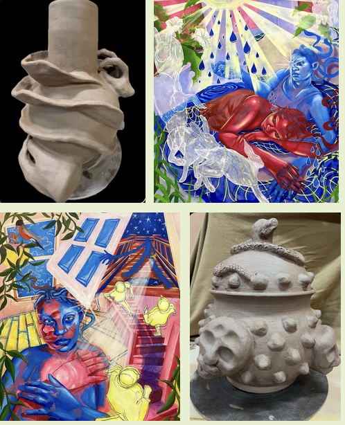 "This project follows my journey through introspection with a series of large scale paintings, where themes of trauma, gender expression, escapism, and misogynoir are dissected. The body is the unifying thread that connects the effects of the themes aforementioned. With this project, I hope to be vulnerable by taking inventory of my life and sharing my internal self-dialogue. yamilkaportorreal.com