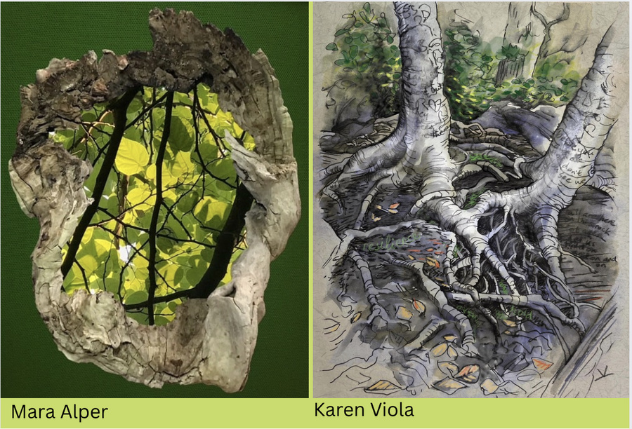 Our deep, reciprocal connection to trees will be exhibited by several artists, offering our community the sense of resilience and sanctuary trees offer. When viewers enter the gallery, they will be immersed in trees created in compelling styles.  Mara Alper’s photo collages and assemblages are inspired by rhythmic patterns of fallen wood, leaves, and vines shaped by water and light. Karen Viola's mixed media and artist books offer distinctive portraits of trees she considers kin.  Three dimensional sculptural works and assemblages, book art pieces, free-standing wood sculptures, illustrations and painting will offer an array of materials and approaches. We will seek a local elementary or middle school emerging artist who shares our connection to trees and also have art workshops and storytelling for all ages about trees in our lives. MaraAlper.com / kvartworks.com