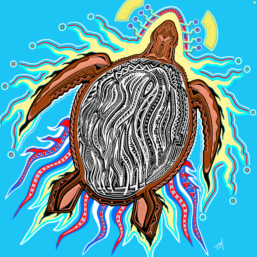 This collection of paintings helps illustrate the origin stories of my Palauan family history. Through my art, I share how deeply I have been inspired by my ancestors. I am particularly inspired by the ancestry of my great-grandmother, an esteemed matriarchal leader from Udes clan, and my great-grandfather Basilius, a descendant of a Portuguese ship navigator who arrived in Palau over 300 years ago. This collection of paintings also includes current work inspired by my father and the collective work we have done together to highlight the significance of our Palauan history and the legacy of our land and its Cuban Mahogany trees. instagram.com/tem_tribal_art/