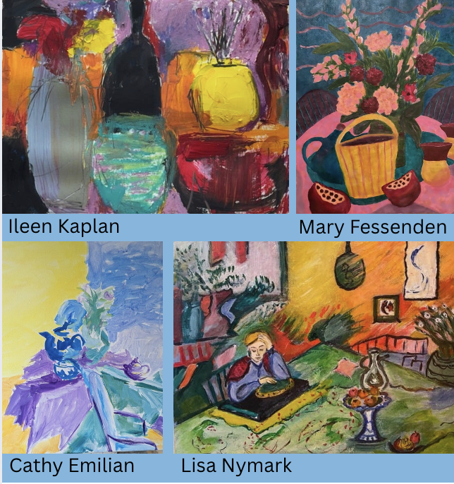 Color in Motion showcases the work of a dedicated group of adult artists in the Ithaca area who have studied together for under instructor Vincent Joseph, whose influences include Cézanne and Bonnard. The class, Modern Art and Painting, centers on an expressive approach: artists are encouraged to paint and draw what they feel in response to the subject, whether a still life or the Finger Lakes landscape.
